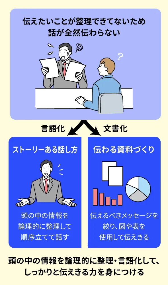 学習ポイント 効果的なコミュニケーションには2つの要素が不可欠です。 伝える力:自分の頭の中を整理した上でまとめ、適切な順序と表現で情報を届ける 伝わる資料:一目で要点が分かり、論理的な流れで説得力を持つ資料を設計する